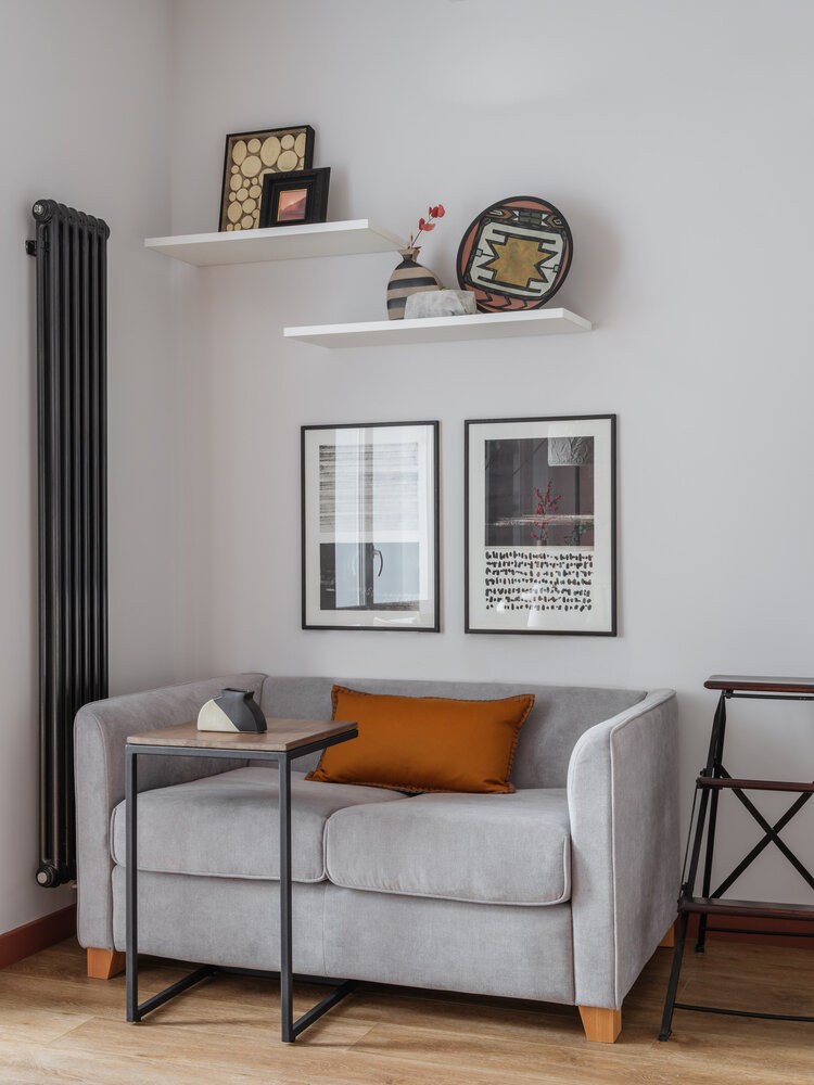 Раскладной диван в гостиной служит дополнительным спальным местом.