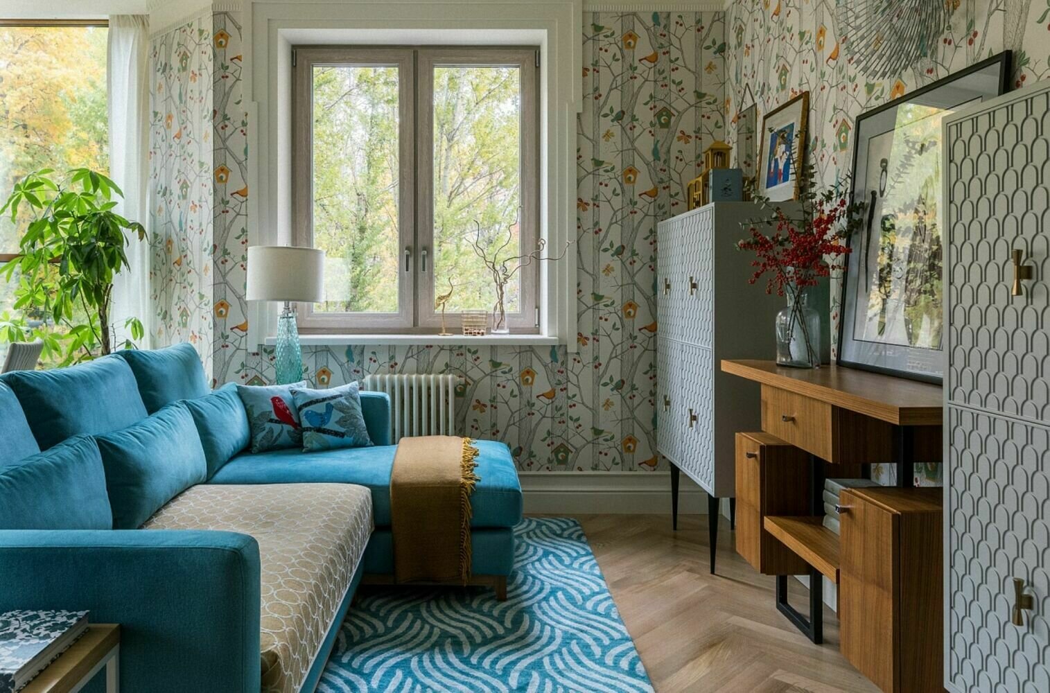 Диван, комод для ТВ и два одинаковых серванта выполнены на заказ по эскизам дизайнеров.