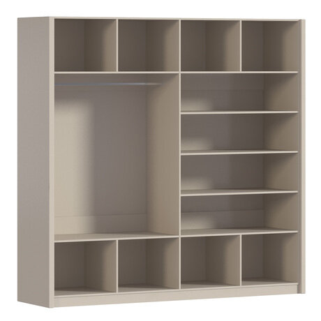 - ЛДСП 16 мм — прочный корпус и фасады от производителя Egger устойчивы к деформации и выдерживают до 50 кг на полку - Система купе Quadro Italum — бесшумное скольжение дверей даже после 10 лет эксплуатации - Задняя стенка из ХДФ 4 мм — придает жесткость конструкции и защищает от пыли - Продольная штанга — выдерживает до 15 кг одежды на погонный метр