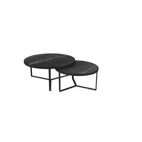 Комплект приставных столиков из металла черного матового цвета. Столешница из МДФ с высокостойкой меламиновой поверхностью и отделкой из глянцевого черного мрамора. Размеры стола: Ø91x41 см и Ø71x36 см.