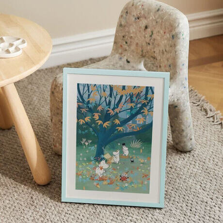 Иллюстрация Муми-тролля, Муми-папы, Сноркедева и Малышки Мю под голубым деревом с падающими листьями. На заднем плане показан Муми-дом. Мотив обрамлен встроенным паспарту.