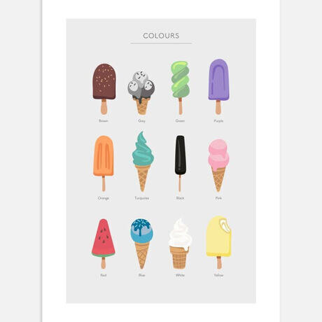 Теперь ваш малыш сможет учить цвета восхитительным способом! Глядя на этот забавный плакат, у вас потекут слюнки, и вы сможете узнать что-то новое в игровой форме. Идеально, если вы хотите мило, но познавательно украсить детскую комнату! Плакат «Цвета мороженого» имеет встроенную белую рамку, которая элегантно обрамляет мотив.